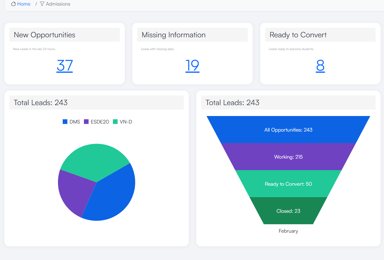 Seamlessly pull and analyze data across key departments including: admissions, financial aid, student accounts, academics, and more to gain a holistic, institution-wide view of student journeys and operational performance. Enable informed decision-making with integrated insights that break down silos and reveal trends across the entire student lifecycle.